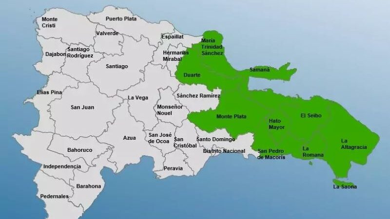 Las provincias en alerta verde son La Romana, El Seibo, San Pedro de Macorís, María Trinidad Sánchez, Samaná, La Altagracia, Duarte, Monte Plata y Hato Mayor.