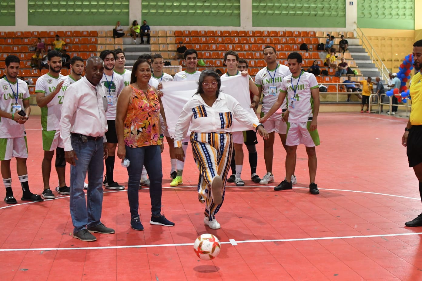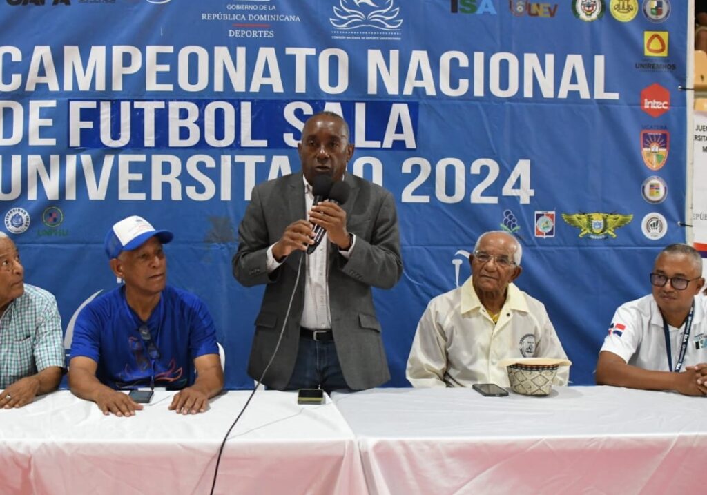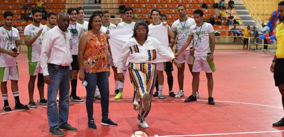 SANTO DOMINGO, RD. Arrancó el fútbol sala de los Juegos Universitario, Adrian de Óleo, Decana De Estudiantes de la Universidad Nacional Pedro Henríquez Ureña, tuvo el saque de Honor y el equipo masculino de la Universidad Católica de Barahona (Ucateba), tuvo la victoria más convincente 10-1, sobre los del Eugenio María de Hostos.