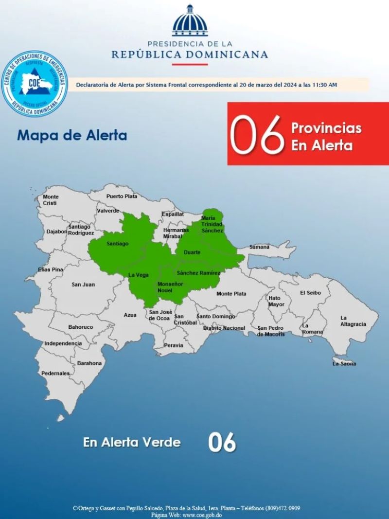 El Centro de Operaciones de Emergencias emitió alerta verde para las provincias Santiago, María Trinidad Sánchez, Duarte, La Vega, Monseñor Nouel y Sánchez Ramírez por posibles inundaciones y deslizamientos de tierra.