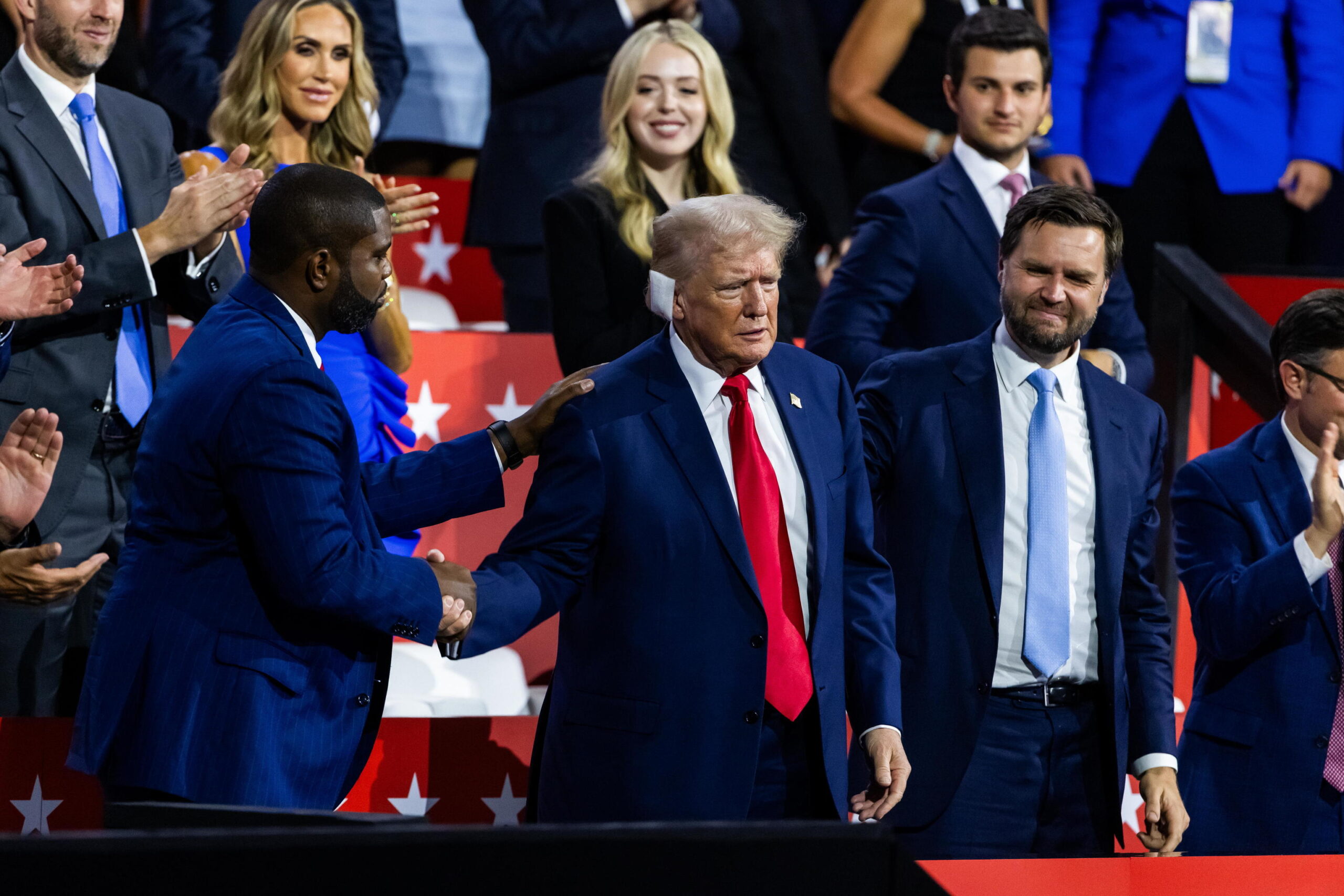 Se abrió paso entre los gritos de una audiencia que horas antes lo había designado oficialmente en una votación unánime de los delegados presentes como la apuesta del Partido Republicano para la Casa Blanca, después de meses de que su candidatura se diera por hecha. Al final de su paseíllo, lo esperaba J. D. Vance, senador por Ohio, escogido este lunes por Trump como aspirante a la vicepresidencia. Como estaba colocado a su izquierda, siempre que el expresidente se giraba para hablar con él las cámaras recogían el perfil de la oreja vendada. Los acompañaban, entre otros, el presentador televisivo ultra Tucker Carlson, Byron Douglas, congresista afroamericano de Florida, y Mike Johnson, presidente de la Cámara de Representantes.