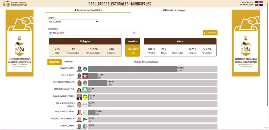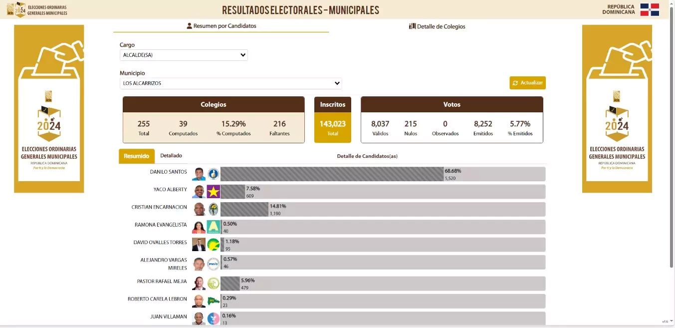 El aspirante a candidato por la alcaldía del municipio Los Alcarrizos, Junior Santos, del Partido Revolucionario Moderno, lidera este domingo las votaciones con un total de 68.68% de acuerdo al primer boletín emitido por la Junta Central Electoral (JCE).