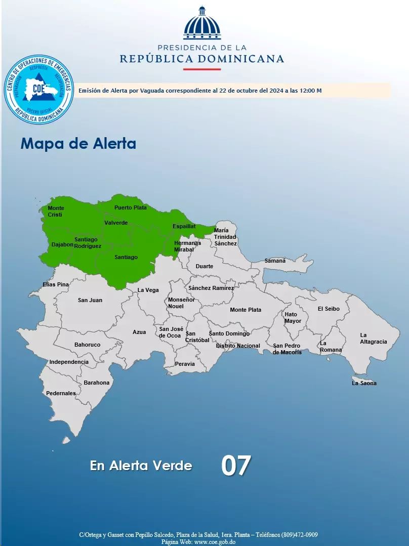 Esta actividad de aguaceros moderados a fuertes con tormentas eléctricas y ráfagas de viento se extenderá en horas de la tarde hacia las regiones noroeste, norte, noreste, la Cordillera Central y la zona fronteriza, principalmente en localidades de las provincias: Monseñor Nouel, La Vega, Santiago, San Juan, Elías Piña, Independencia, Pedernales, Santiago Rodríguez, Dajabón, Valverde, Montecristi, Puerto Plata, Espaillat, Hermanas Mirabal, Duarte, María Trinidad Sánchez, El Seibo y Hato Mayor, hasta primeras horas de la noche.